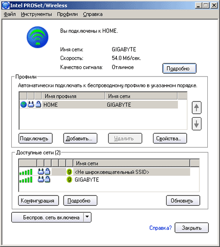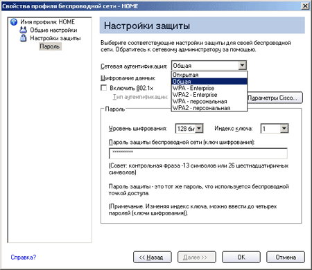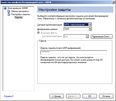 Пример настройки WPA-шифрования на беспроводном адаптере с помощью утилиты Intel PROSet/Wireless !