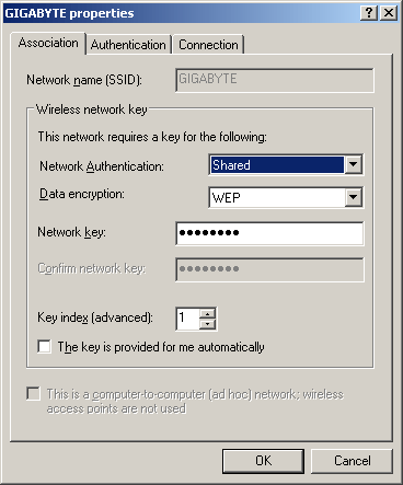 установите тип сетевой аутентификации (Network Authentication) Shared, тип шифрования (Data encryption) WEP и введите точно такой же ключ шифрования, который был задан при настройке точки доступа. Рис. 12. Задание параметров WEP-шифрования на беспроводном адаптере с помощью клиента Microsoft Настройка WPA-шифрования Если есть возможность использовать WPA-шифрование (то есть если все устройства сети его поддерживают), то рекомендуется выбрать именно этот тип шифрования. Существует два типа WPA-шифрования: стандартный режим WPA (иногда встречается название WPA - Enterprise) и WPA Pre-shared key или WPA - персональный. Режим WPA - Enterprise используется в корпоративных сетях, поскольку требует наличия RADIUS-сервера. Естественно, что в домашних условиях воспользоваться данным режимом не удастся. А вот режим WPA Pre-shared key предназначен для персонального использования. Этот режим предусматривает использование заранее заданных ключей шифрования (пароль доступа), одинаковых для всех сетевых устройств, а первичная аутентификация пользователей осуществляется с использованием данного ключа.