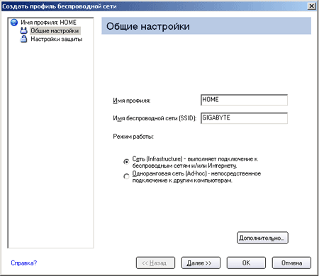Диалоговое окно настройки беспроводного соединения Нажмите на кнопку 'Добавить', чтобы создать профиль нового беспроводного соединения. В открывшемся диалоговом окне 'Создать профиль беспроводной сети' (рис. 8) введите имя профиля (например, HOME) и имя беспроводной сети (SSID), которое было задано при настройке точки доступа.