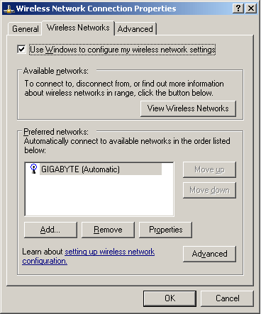 Диалоговое окно настройки нового профиля беспроводного сети Далее предлагается настроить защиту беспроводной сети, но на первом этапе (этап отладки) делать этого не нужно, поэтому следующие диалоговые окна оставляем без изменений. Настройка с использованием клиента Microsoft При использовании для настройки беспроводного адаптера клиента Microsoft (универсальный метод, который подходит для всех беспроводных адаптеров) прежде всего следует убедиться в том, что не используется иная утилита управления адаптером. Щелкните на значке My Network Places (Сетевое окружение) правой кнопкой мыши и в открывшемся списке выберите пункт Properties (Свойства). В открывшемся окне Network Connection (Сетевые соединения) выберите значок Wireless Network Connection (Беспроводные соединения) и, щёлкнув на нём правой кнопкой мыши, снова перейдите к пункту Properties. После этого должно открыться диалоговое окно Wireless Network Connection Properties (Свойства беспроводного сетевого соединения), позволяющее настраивать беспроводной сетевой адаптер(рис. 5).