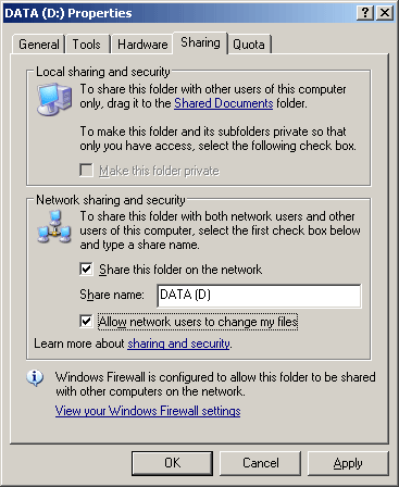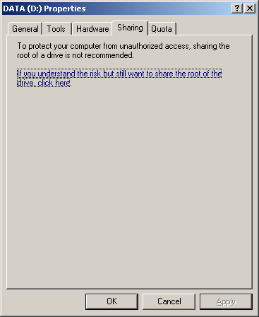 Диалоговое окно создания разделяемого логического диска В этом диалоговом окне имеется только одна опция : 'if you understand the risk but still want to share the root of the drive, click here'. Это не что иное, как предупреждение о риске разделения логического диска. Если вы, несмотря ни на что, желаете сделать этот диск доступным для пользователей сети, то просто щёлкните на этой надписи. Диалоговое окно изменит свое вид, и в новом окне (рис. 8) нужно будет выбрать пункт 'Share this folder on the network' (сделать данную папку (диск) доступной для пользователей сети'). Кроме того, если вы хотите, чтобы данные разделяемого диска могли изменять (а не только скачивать) пользователи сети, то необходимо дополнительно выбрать опцию 'Allow network users to change my files' (разрешить пользователям сети